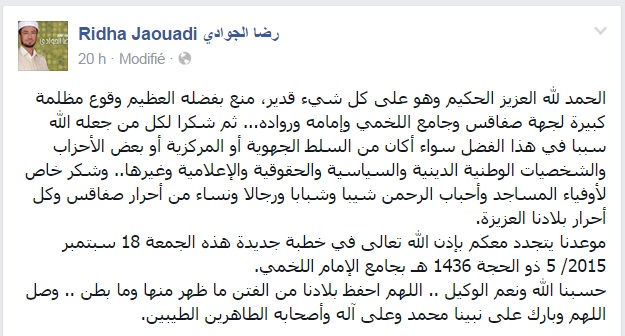 وسط إختلاف عميق في المواقف و في التصريحات بين وزارة الشؤون الدينية في شخص المكلفة بالإعلام نجاة الهمامي و رضا الجوادي إمام جامع سيدي اللخمي يرتقب الجميع غدا الجمعة شكل صلاة الجمعة و كيف ستكون بجامع سيدي اللخمي مع طرح جميع الفرضيات الممكنة .