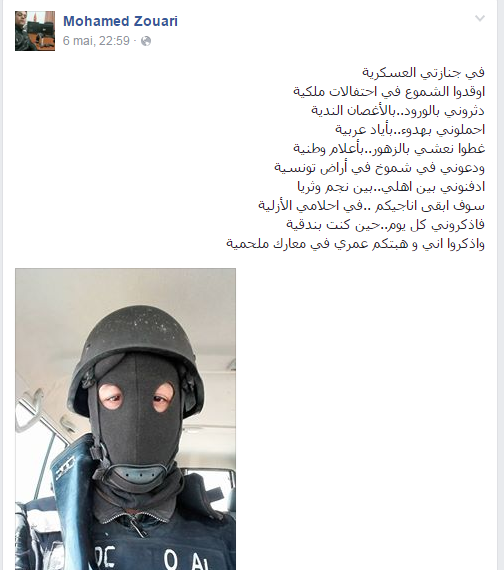 نشر احد الشهداء و هو العريف الأول محمد اسلام الزواري، أصيل ولاية الكاف الذي استشهد امس الاربعاء في المواجهات مع الارهابين بتطاوين في تدوينة على صفحته الشخصية على الفايسبوك بتاريخ 6 ماي 2016، وكأنه يودع الحياة ويتجهز ليهب روحه الزكية فداء لعزة تونس، وفي ما يلي نصها :