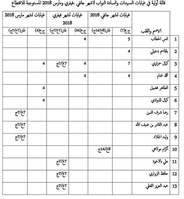 هذه قائمة الـ13 نائبا الذين سيتم الاقتطاع من منحهم الأخبار الوطنية في 2018-05-15 10:59 Share نشر مجلس نواب الشعب قائمة أولية في غيابات النواب لاشهر جانفي،فيفري ومارس 2018 والمستوجبة للاقتطاع من منحهم. وتضم القائمة 13 نائبا. وفي ما يلي التفاصيل: الاقتطاعمجلس نواب الشعبنواب Share