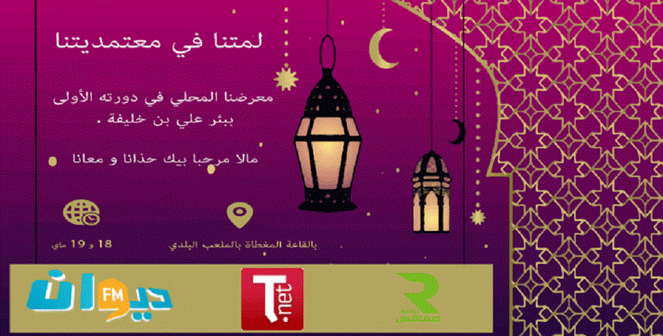 بادرت النشطتان في المجتمع المدني أمال بن عامر و نورس الودرني اصيلتا معتمدية بئر على بن خليفة من ولاية صفاقس بتنظيم معرض للصناعات التقلدية و المنتوجات اليدوية بعنوان “لمتنا في معتمديتنا ” في دورته الأولي وذلك يومي 18و 19ماي 2019 ، بالقاعة المغطاة بالملعب البلدي بالجهة.