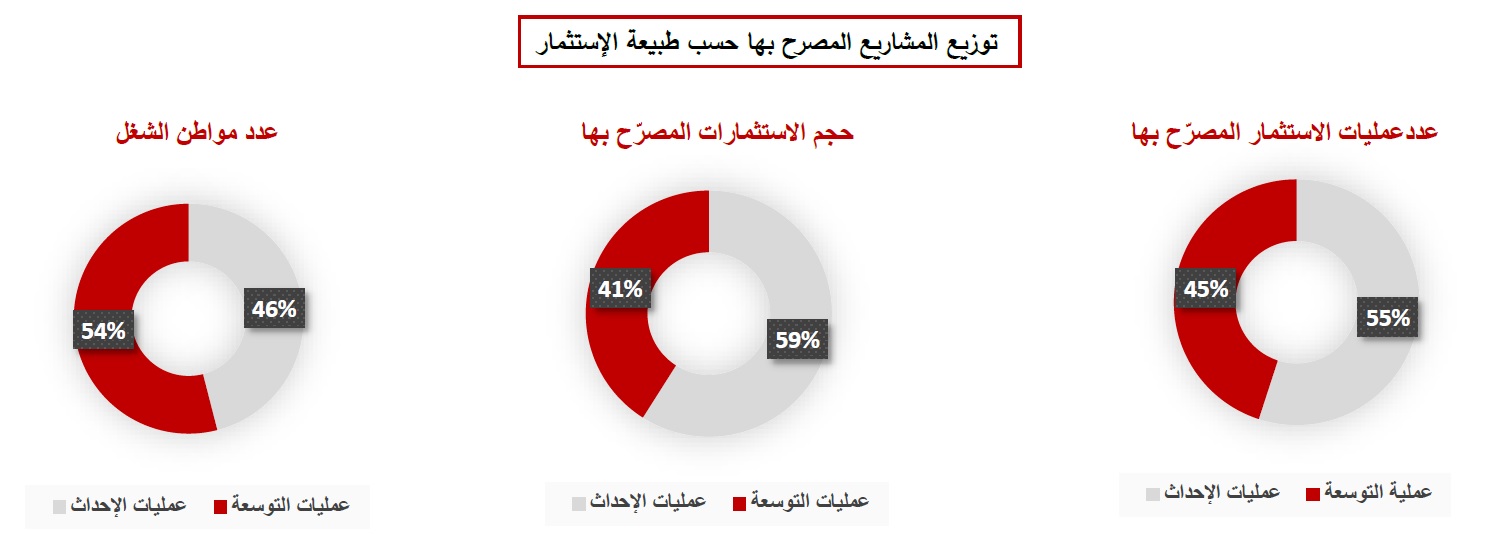 تشمل المشاريع المصرح بها إلى حدود شهر نوفمبر 2020 عمليات توسعة لمشاريع قائمة الذات وعمليات إحداث مشاريع جديدة، حيث بلغ عدد مشاريع التوسعة 22 مشروعا وهو ما يمثل 45 % من عدد المشاريع المصرح بها في حين بلغ عدد مشاريع الإحداث 27 مشروعا لتمثل بذلك 55%.
