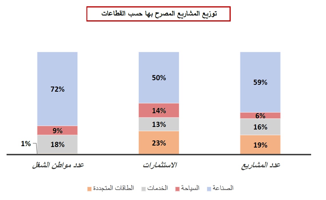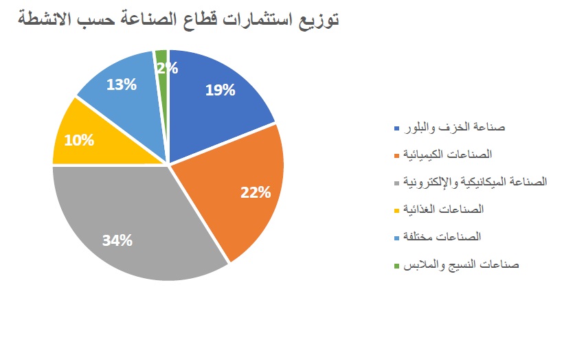 تجدر الإشارة أن قطاع الصناعة يحتل الصدارة من حيث عدد المشاريع ويشمل أساسا مشاريع الصناعات الإلكترونية والميكانيكية التي تمثل 34% من حيث كلفة الاستثمارات الصناعية و57% من حيث مواطن الشغل المزمع إحداثها في هذا القطاع.