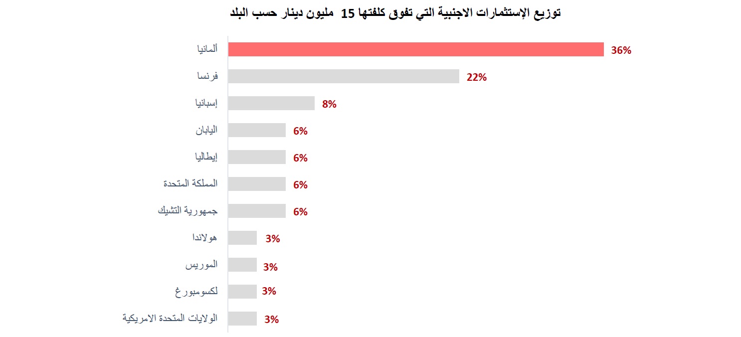 وتعكس الإحصائيات المتعلقة بالمساهمة الأجنبية محافظة الشركاء الإستراتجيين على المستوى الاقتصادي لتونس على الريادة من حيث عدد المشاريع المصرح بها والمزمع إنجازها ببلادنا حيث تحتل ألمانيا المركز الأول بنسبة 36% من جملة المشاريع ذات المساهمة الأجنبية تليها فرنسا بنسبة22 % وإسبانيا بنسبة 8 % .