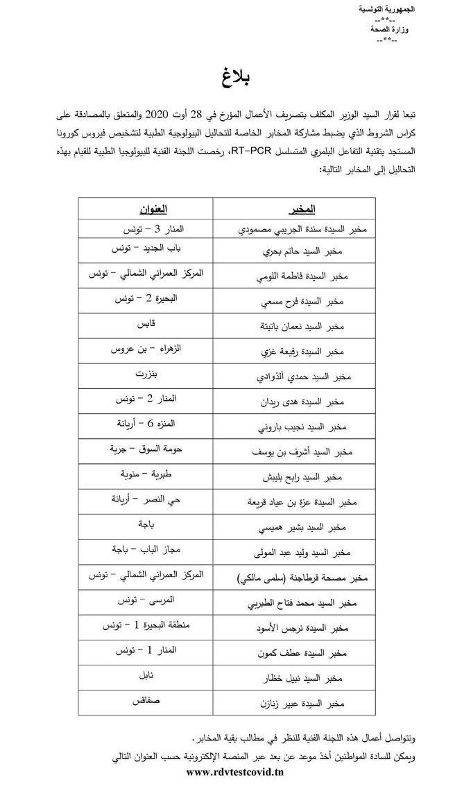 نشرت وزارة الصحة منذ يومين، قائمة مفصلة لمخابر جديدة مرخصة للشروع في انجاز تحاليل التقصي عن فيروس كورونا المستجد. وفي صفاقس, وإلى حدود اليوم اليوم الأثنين 28 سبتمبر 2020, تحصل مخبر الدكتورة عبير زنازن بمصحة ابن خلدون بصفاقس وهو المخبر الوحيد المرخص وفق بلاغ الوزارة في الجهة.