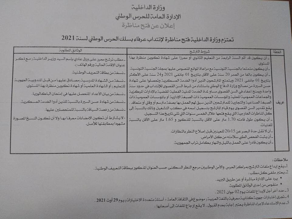 تعتزم وزارة الداخلية فتح مناظرة لإنتداب عرفاء بسلك الحرس الوطني لسنة 2021، وقد حدد آخر أجل لايداع الترشحات بمراكز الأمن و الحرس مرجع نظر السكنى يوم 2 جوان 2021.
