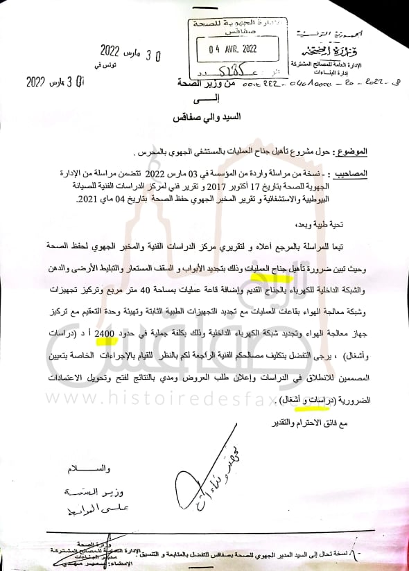 وحسب المراسلة التي تحصل موقع تاريخ صفاقس على نسخة منها، موجهة من قبل وزير الصحة إلى والي صفاقس، أن المشروع يتمثل أساسا في إضافة قاعة عمليات جديدة بمساحة 40 متر مربع وتركيز تجهيزات وشبكة معالجة الهواء بقاعات العمليات مع تجهيز التجهيزات الطبية الثابتة وتهيئة وحدة التعقيم مع تركيز جهاز معالجة الهواء وتجديد شبكة الكهرباء الداخلية بالجناح القديم وتجديد الأبواب والسقف المستعار والتبليط الأرضي والدهن، وذلك بكلفة جملية 2400 ألف دينار (دراسات واشغال).