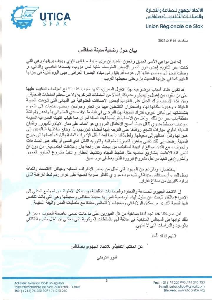 اصدر الاتحاد الجهوي للصناعة والتجارة والصناعات التقليدية بصفاقس، اليوم الخميس 10 أفريل 2025، بيانا أطلق من خلاله صرخة فزع حول الوضعية التي آلت إليها مدينة صفاقس والتي وصفها بـ “المزرية”.