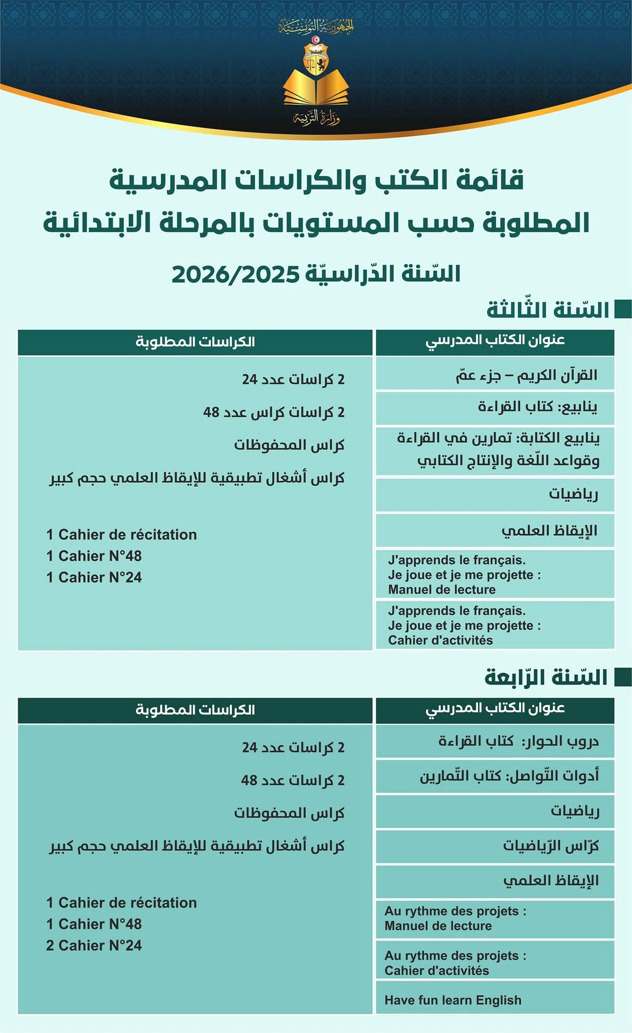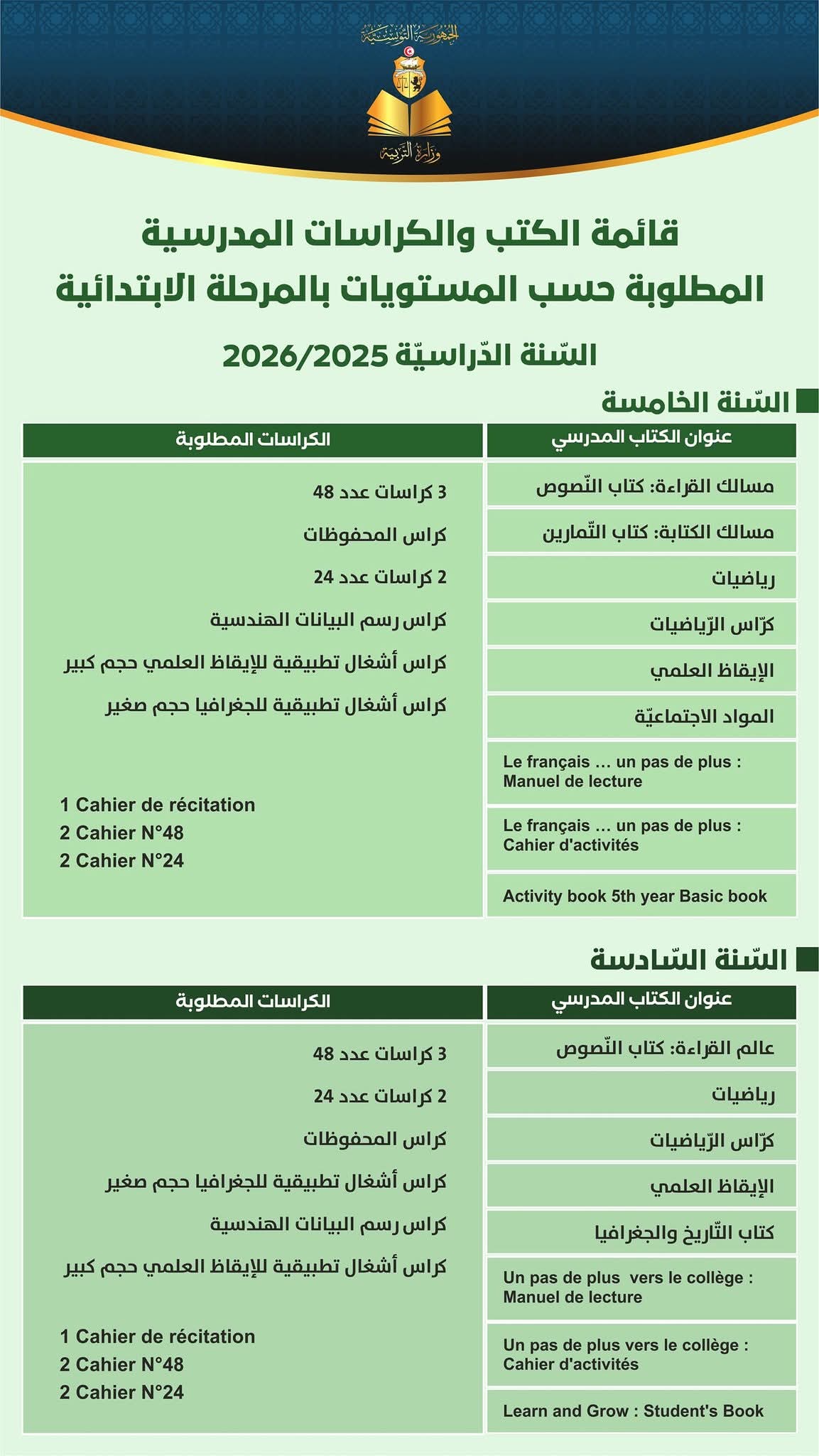 وزارة التربية: قائمة الكتب والكراسات المدرسية المطلوبة حسب المستويات (صور) الأخبار الوطنية في 2025-08-14 09:09 Share أعلنت وزارة التربية عن قائمة الكتب والكراسات المدرسية حسب المستويات في المرحلة الابتدائية. وفي ما يلي القائمة كاملة: الكتبالكراسات المدرسيةالمستوياتقائمةوزارة التربية Share