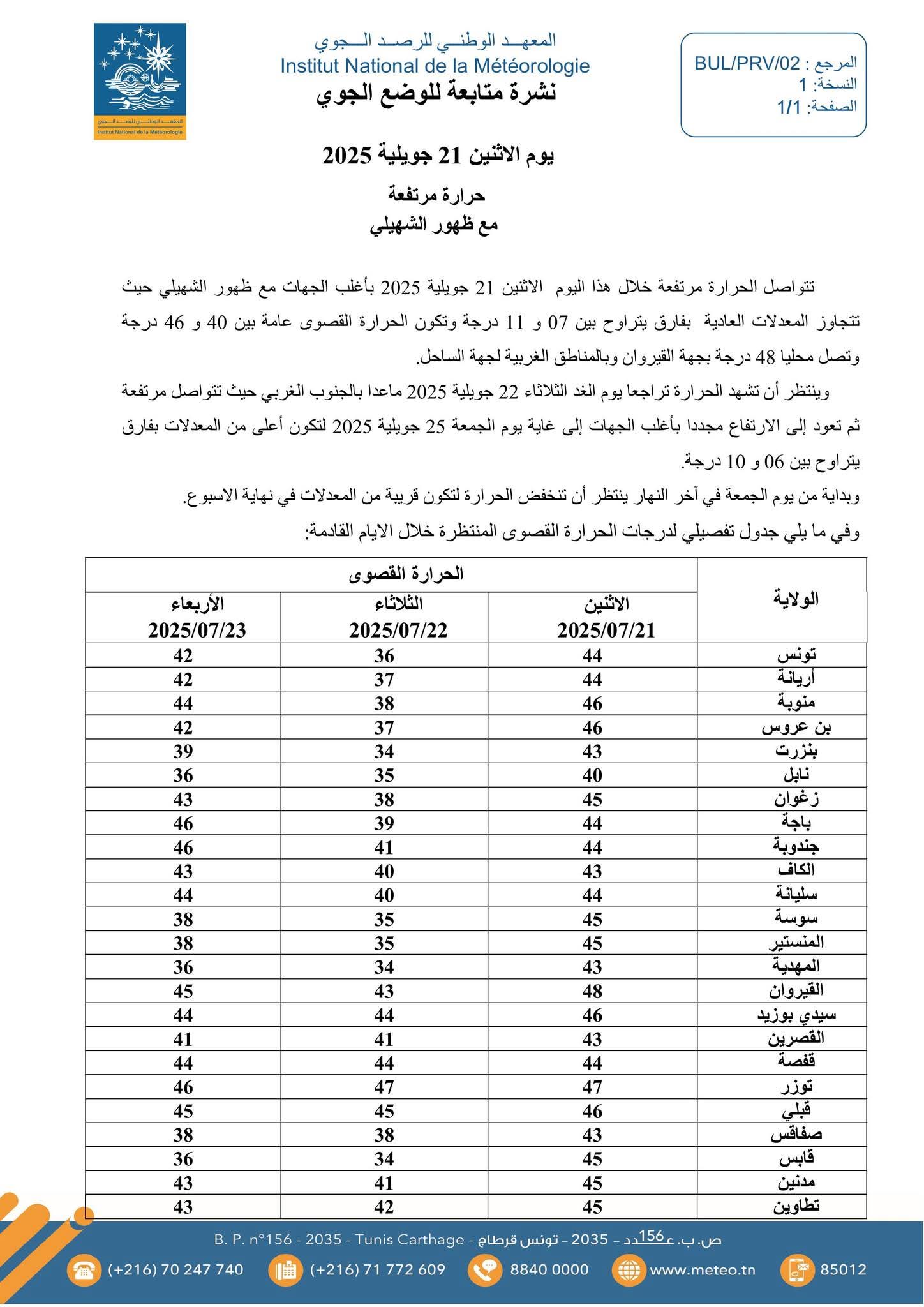 وفي ما يلي جدول تفصيلي لدرجات الحرارة القصوى في مختلف الولايات: