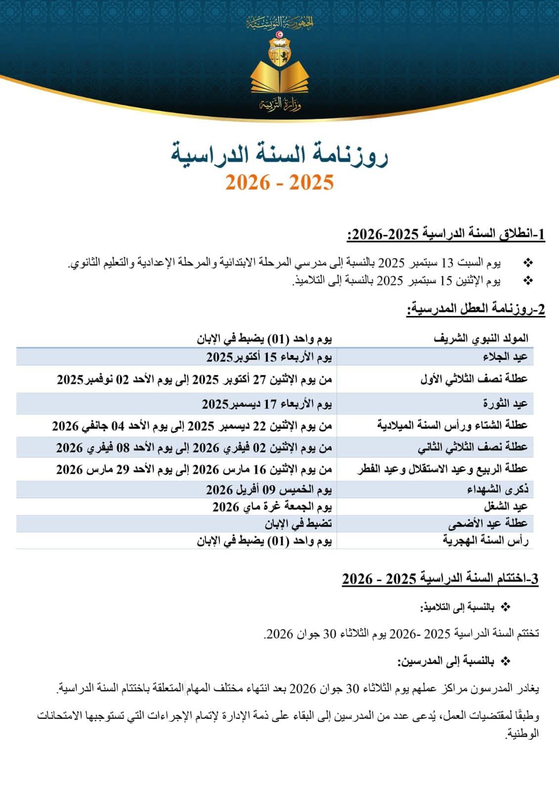 وتنطلق السنة الدراسية يوم السبت 13 سبتمبر 2025 بالنسبة إلى مدرسي المرحلة الابتدائية والمرحلة الإعدادية والتعليم الثانوي فيما تنطلق يوم 15 سبتمبر بالنسبة للتلاميذ لأنني يوم 30 جوان 2026.