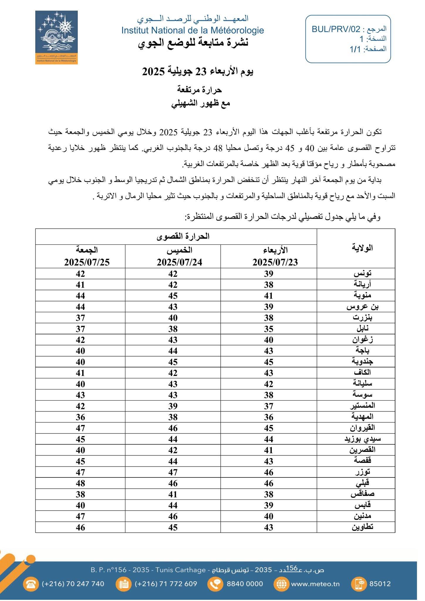 ترتفع درجات الحرارة بأغلب الجهات يومي الخميس والجمعة 24 و25 جويلية 2025، حيث تتراوح القصوى عامة بين 40 و45 درجة وتصل محليّا 48 درجة بالجنوب الغربي.