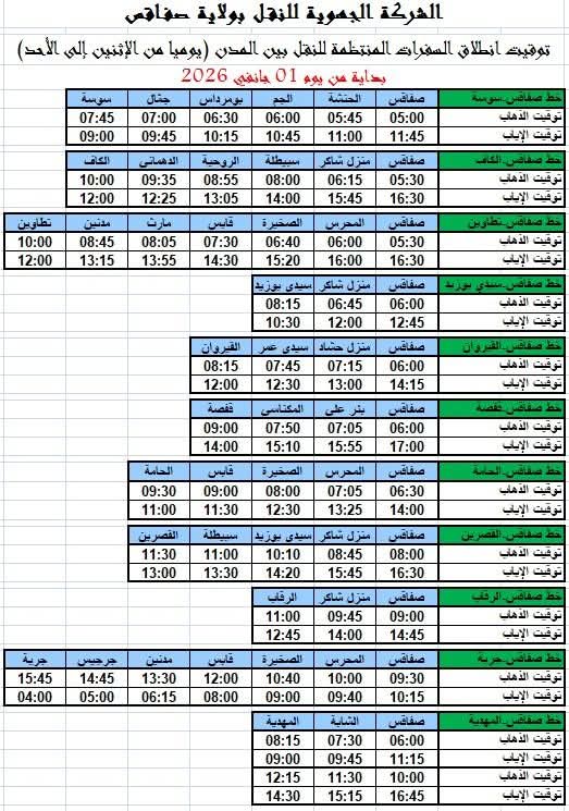 شركة النقل بصفاقس: توقيت انطلاق السفرات المنتظمة للنقل بين المدن لسنة 2026 (صورة) أخبار صفاقس في 2026-01-02 09:07 Share أعلنت الشركة الجهوية للنقل بصفاقس عن توقيت انطلاق السفرات المنتظمة للنقل بين المدن يوميا بداية من 1 جانفي 2026. وفي ما يلي الرزنامة كاملة: السفرات المنتظمةالشركة الجهوية للنقلالمدنصفاقس Share