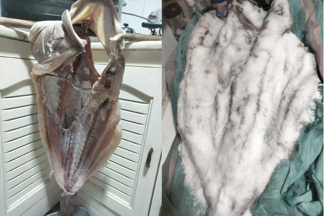 تُلفّ الأسماك في القماش وتُربط بإحكام بخيط دائري، ثم تُعلَّق في مكان جيد التهوية حتى تجفّ ويسقط الماء الناتج عن تفاعل الملح مع السمك.