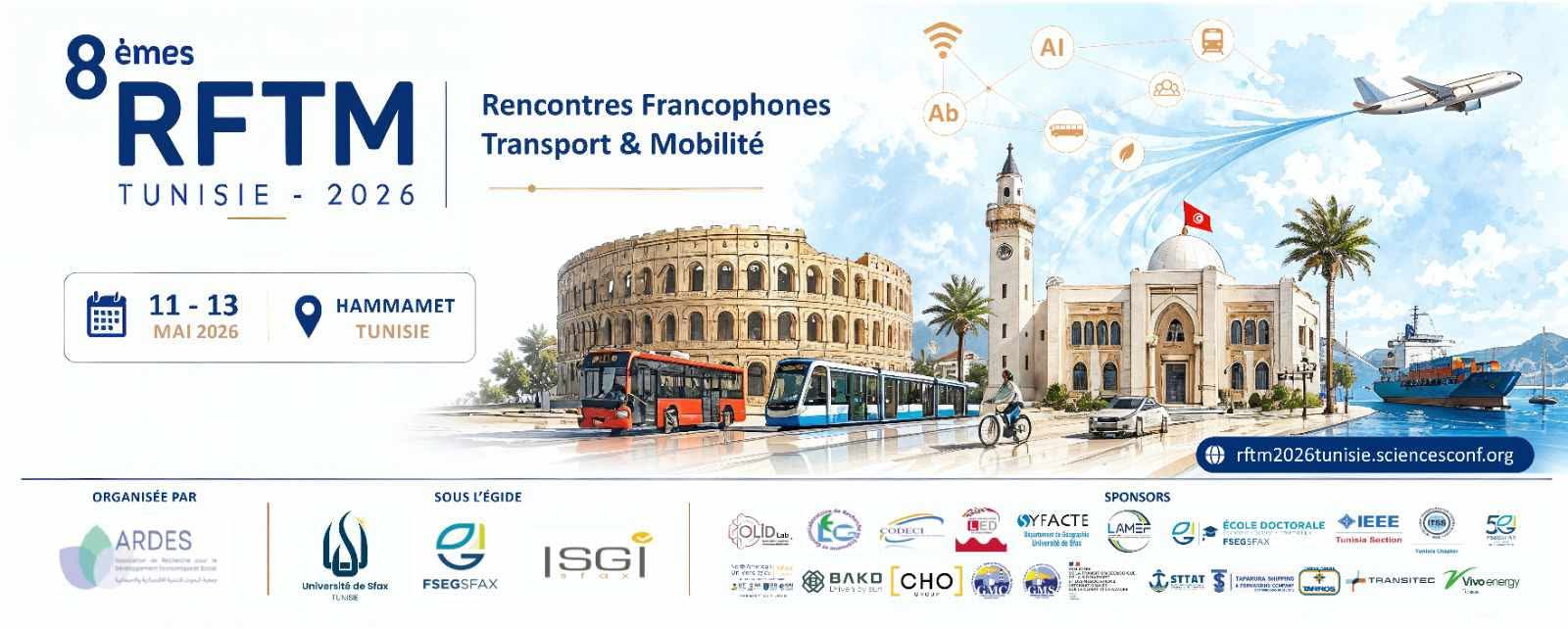 تنظم جمعية البحوث للتنمية الاقتصادية والاجتماعية باشراف جامعة صفاقس والمعهد العالي للتصرف الصناعي بصفاقس وكلية العلوم الاقتصاديّة والتّصرف بصفاقس الملتقى الفرنكوفوني الثامن للنقل والتنقل RFTM 2026 لأول مرّة في تونس وذلك أيام 11 و12 و13 ماي 2026 بمدينة ياسمين الحمامات.