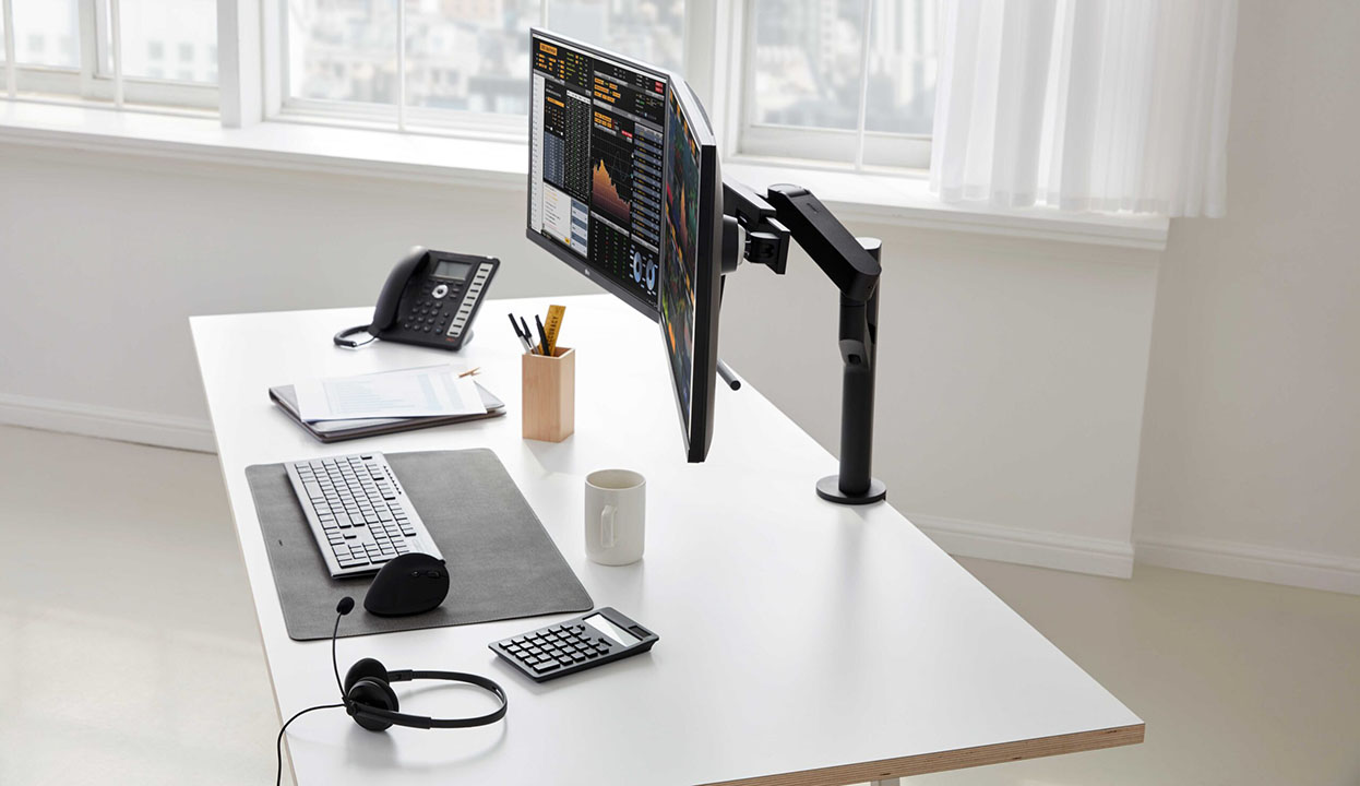Nécessitant très peu d’espace sur le bureau pour un espace de travail propre et dégagé, la pince C-Clamp de LG, dont le brevet est en instance, utilise un œillet mince et robuste permettant aux utilisateurs de fixer facilement le support sur le bord d’un bureau ou d’un trou de câble pour travailler (ou jouer) en un rien de temps.